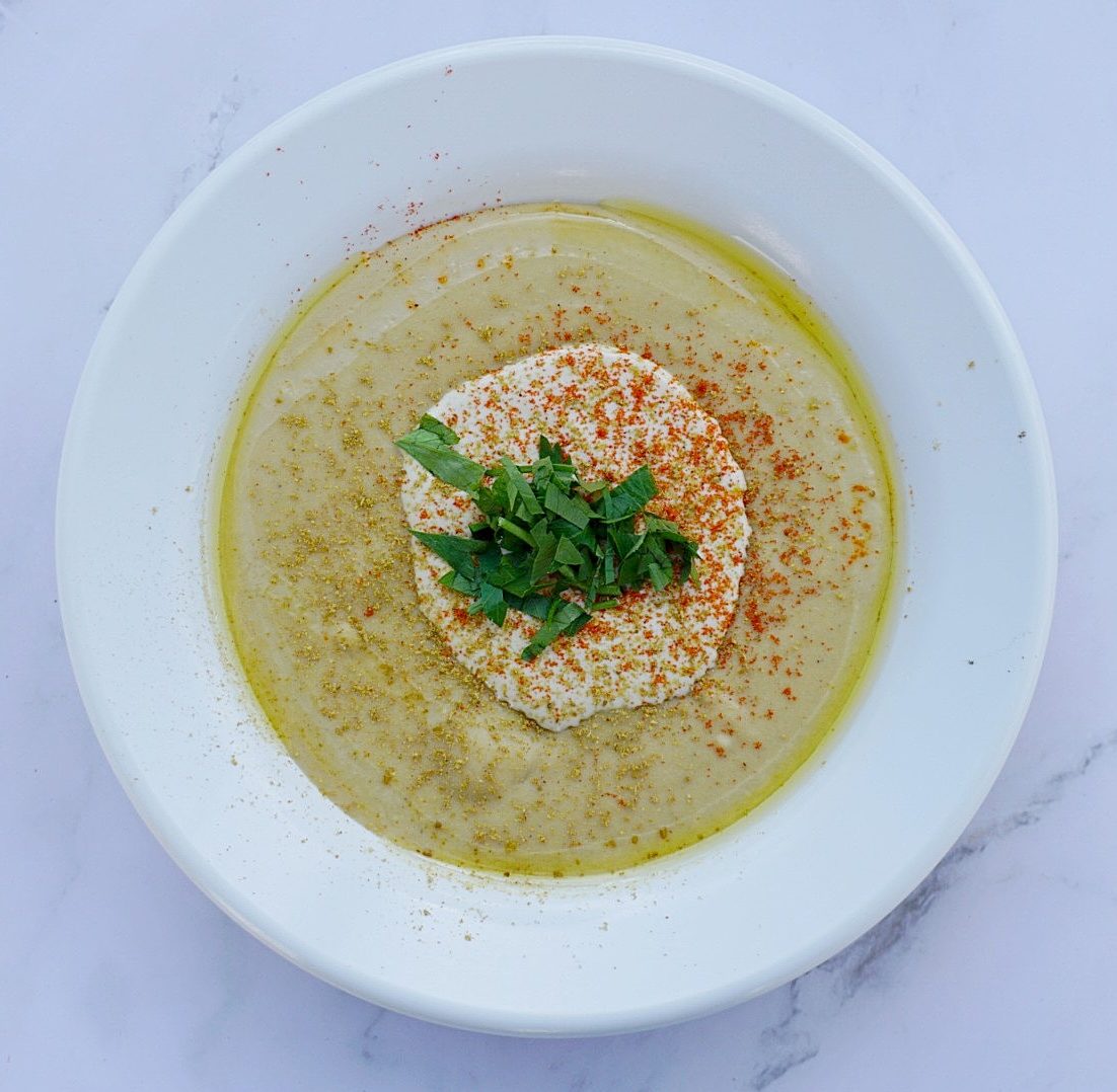 חומוס עם טחינה, שמן זית, פפריקה, כמון ופטרוזיליה